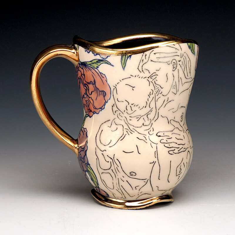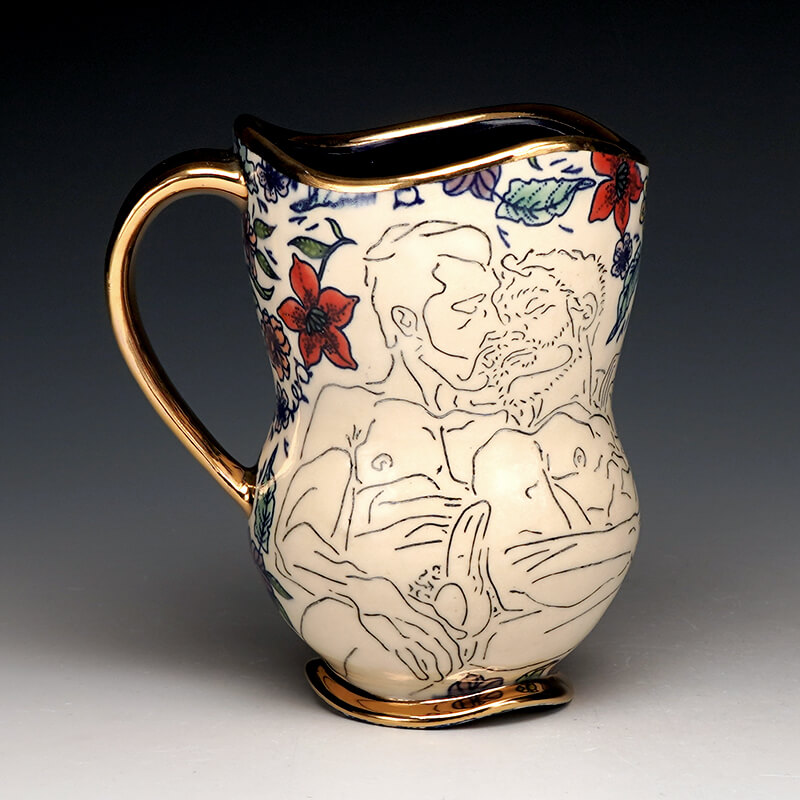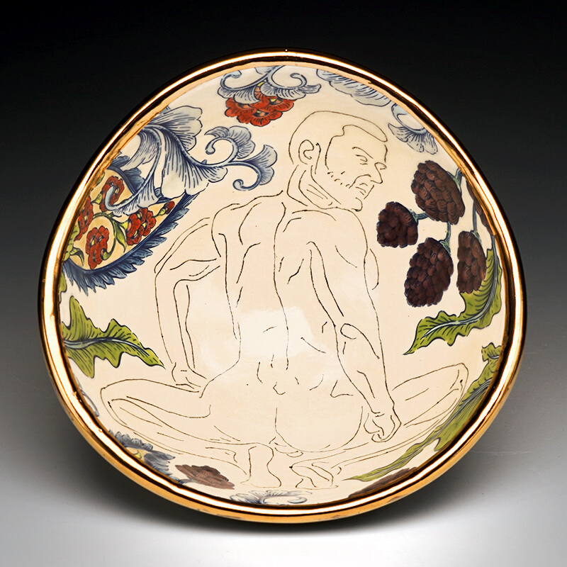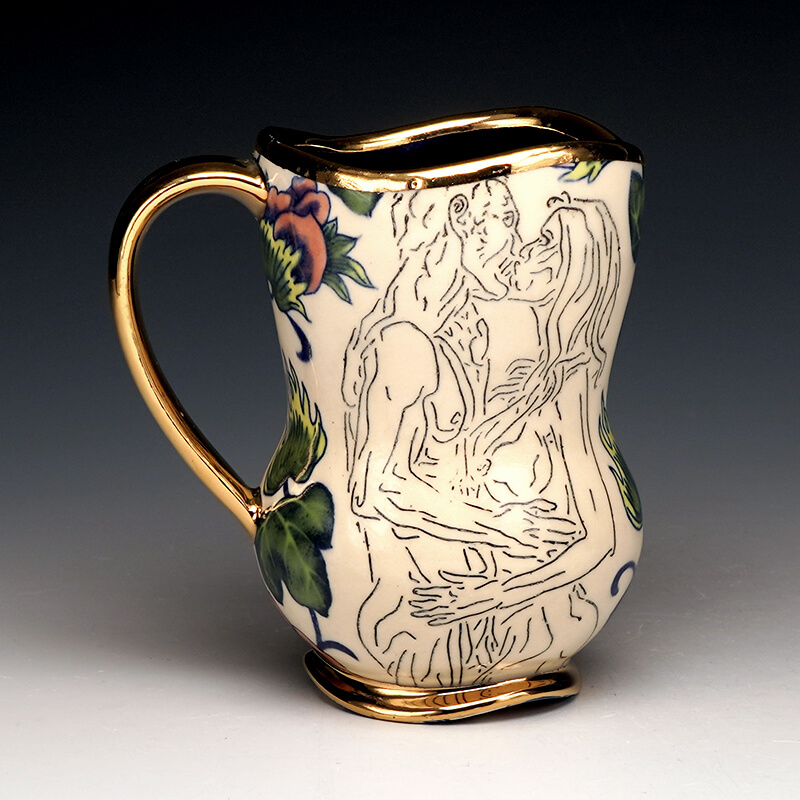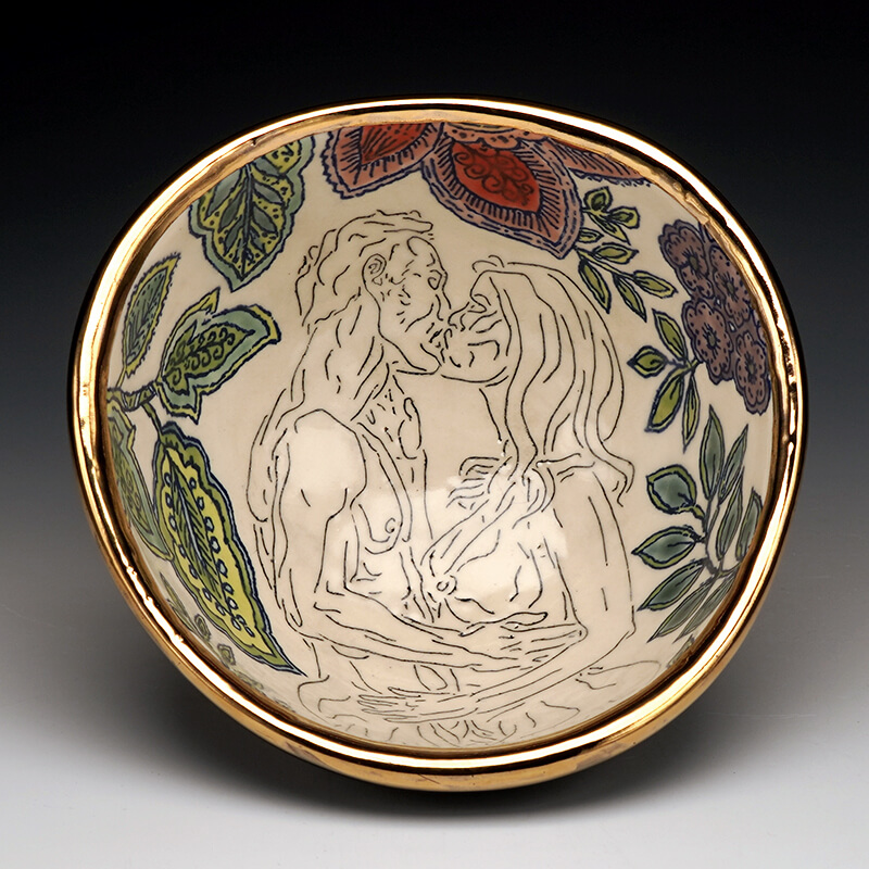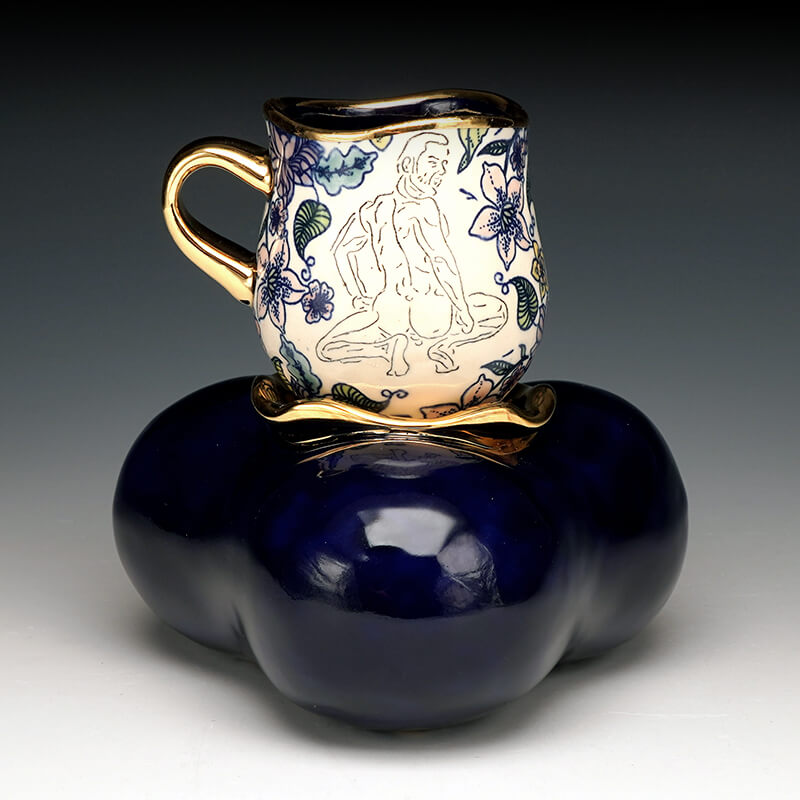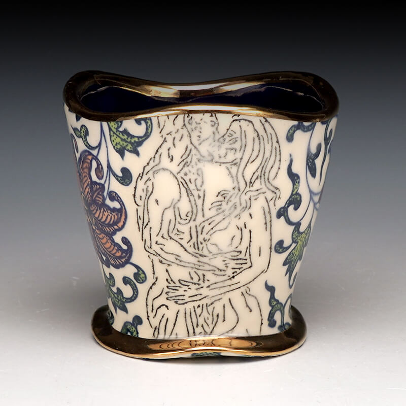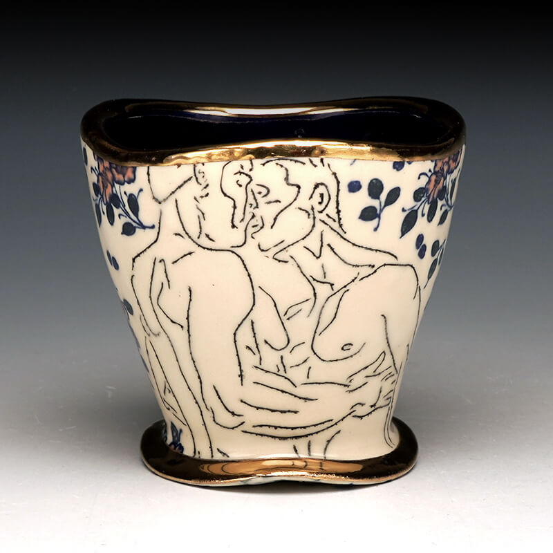 Throughout time, dining has always been viewed as a sensual experience. Food and drink ignite the senses, and the flowers decorating the dining table are literally the sex organ of plants. By drawing graphic and erotic sexual scenes on food and flower vessels, I seek to highlight the sensuality inherent in the dining experience. In addition, I throw almost all my work on the potter’s wheel, which is in itself a sensual act of movement and touch: the clay slips through my fingers and responds to my caress. The sexual imagery couples the slippery sensuality of creation and the aromatic experience of eating. Furthermore, both sharing a meal and having sex are highly intimate experiences; I combine both acts into one in all my work.