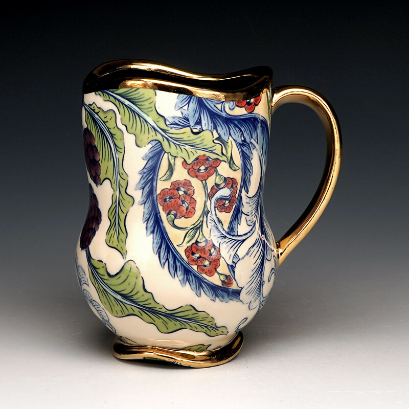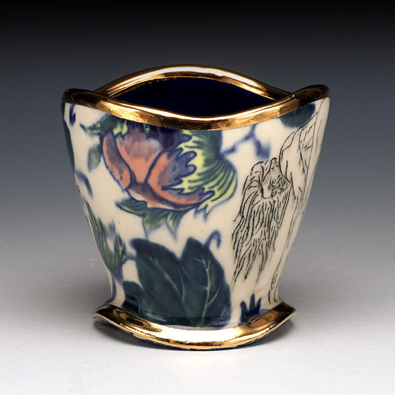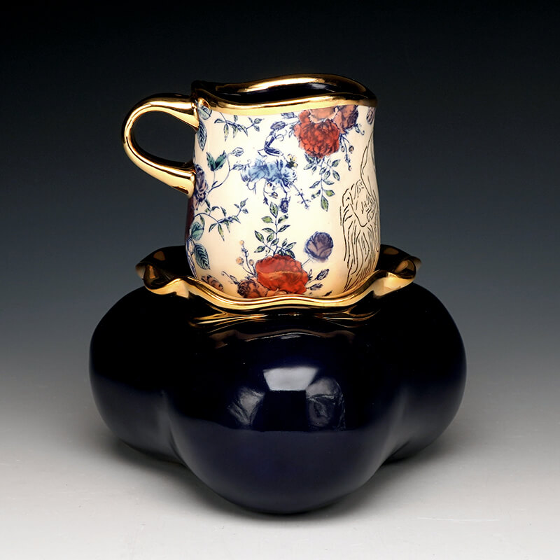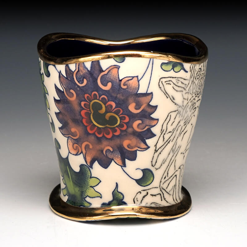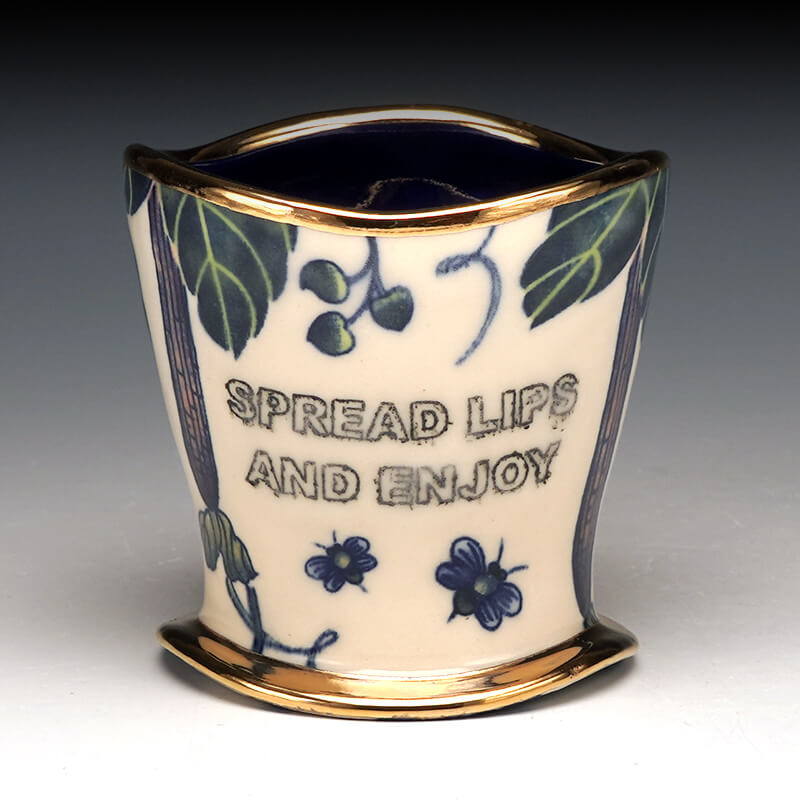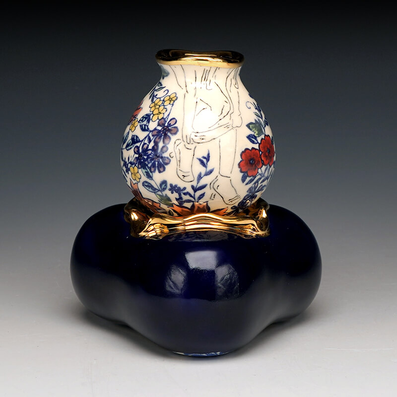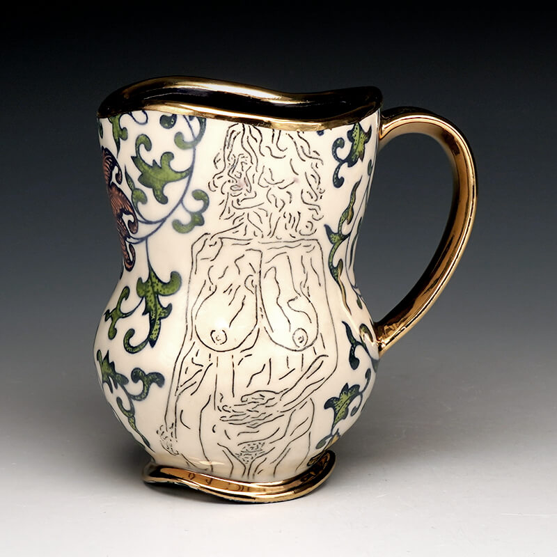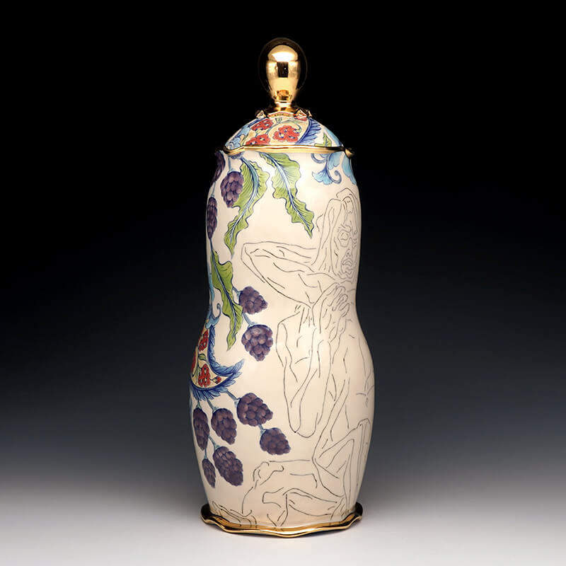 Throughout time, dining has always been viewed as a sensual experience. Food and drink ignite the senses, and the flowers decorating the dining table are literally the sex organ of plants. By drawing graphic and erotic sexual scenes on food and flower vessels, I seek to highlight the sensuality inherent in the dining experience. In addition, I throw almost all my work on the potter’s wheel, which is in itself a sensual act of movement and touch: the clay slips through my fingers and responds to my caress. The sexual imagery couples the slippery sensuality of creation and the aromatic experience of eating. Furthermore, both sharing a meal and having sex are highly intimate experiences; I combine both acts into one in all my work.