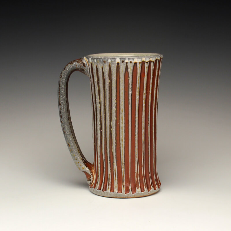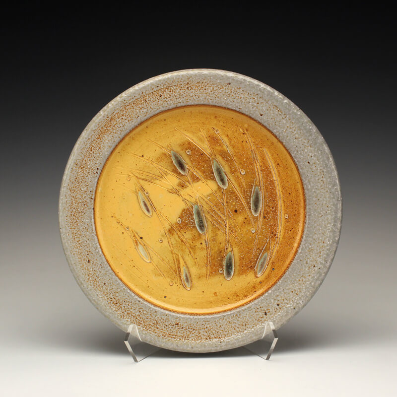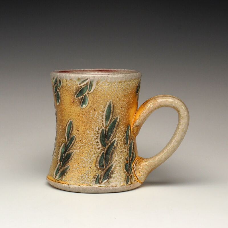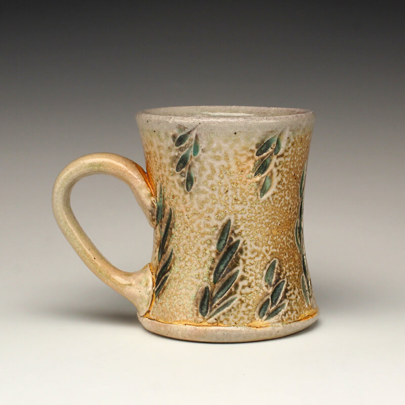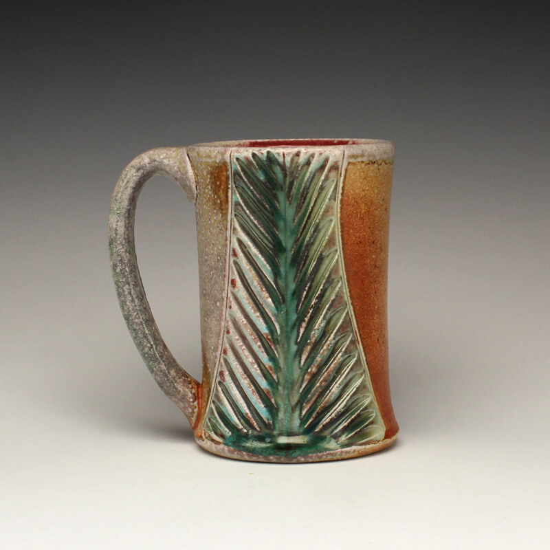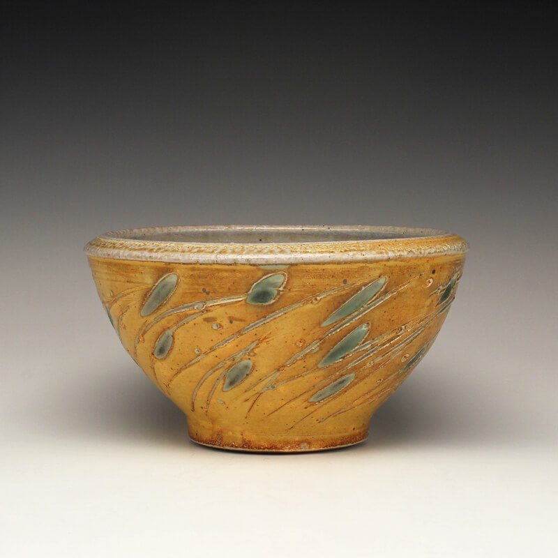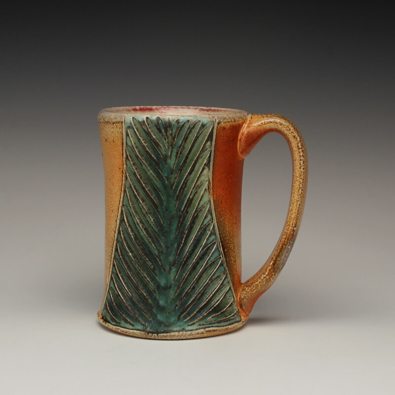 Integrating the way I experience the world with the way I design and create functional pottery is essential to my creativity. Whether rinsing garden tomatoes at the kitchen sink, or pausing to study wildflowers along the trail, I believe in taking time to notice the little details of life. I am just as awed by the way a leaf connects to its stem as I am the folds of a mountain range or bursts of clouds at sunset. I always view these things with an eye toward conserving and celebrating the environment that I live in. My work bears the mark of these values, resulting in uniquely designed pottery that is just as inviting to ponder and touch as it is to use and share. I make wheel-thrown and hand-built wares for the home, including bowls, cups, plates, pitchers, vases, servers, lidded jars, teapots, and platters. My color palate features earthy reds, deep browns, soft blushes of whites, twilight blues and natural variations of pattern that result from the wood and soda firings. To pair with these tones of autumn, I add glazes of brilliant ambers, warm yellows, shades of golden honey, and watery olive greens to the carved areas. Glazes spread and lightly pool across textured surfaces and highlight the curve of a handle, the lip of a tumbler, or the small peak or divot on a bowl. While I pay equal attention to form, surface, and detail, my pottery is most celebrated for its elegantly carved or pressed patterns inspired by nature. These patterns accrue a rhythm all their own as they swirl, spiral, and drape across surfaces, suggesting waving grass, ripples in a stream, stalks of wheat, terraced slopes, thistles and pods, or windblown tracks in the sand. Cradling a cup or bowl in their hands, people feel inspired to bring a sense of awareness and ritual into their lives. In the end, I hope that echoes of the natural world in my work invite them to consider the importance of conservation and conscious living. – Joy Tanner