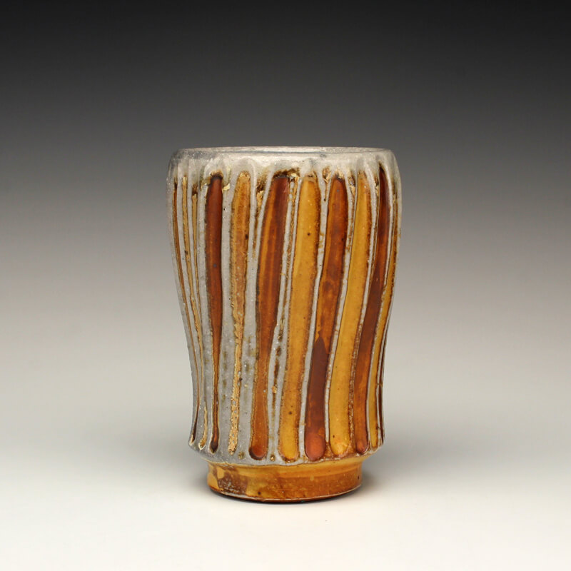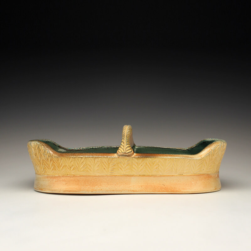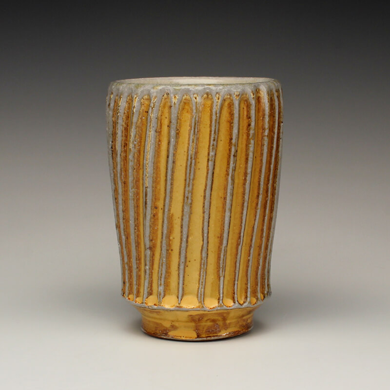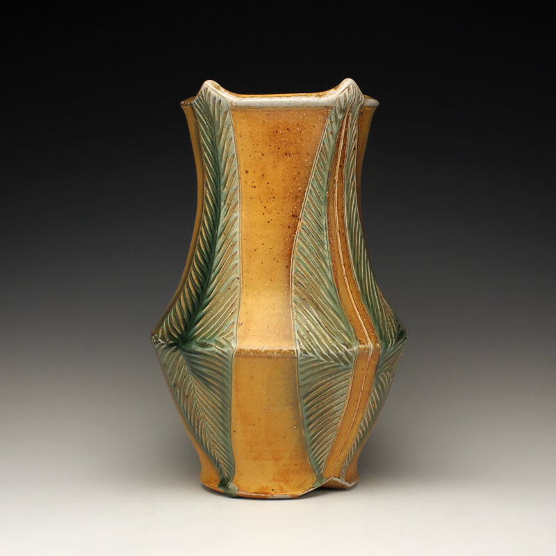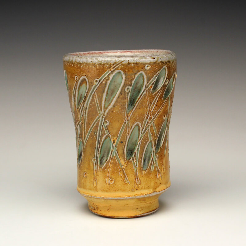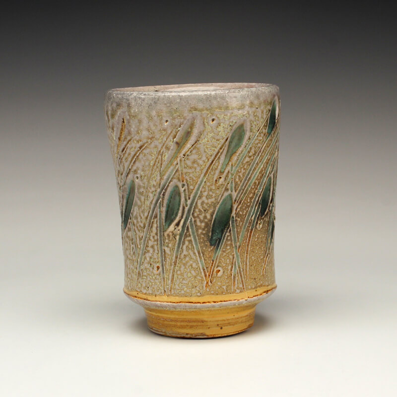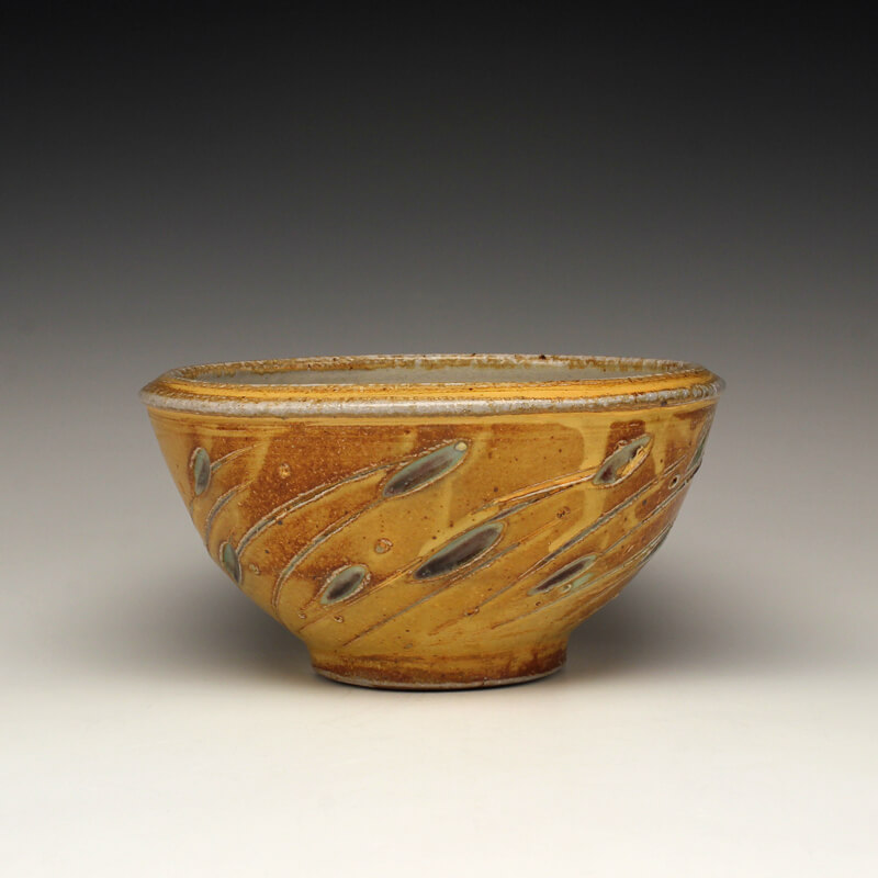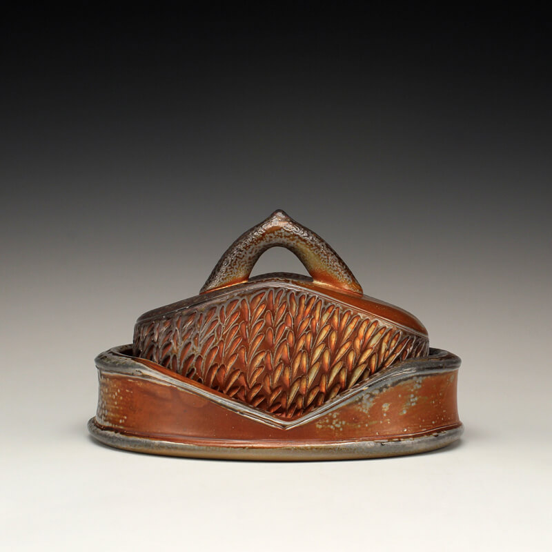 Integrating the way I experience the world with the way I design and create functional pottery is essential to my creativity. Whether rinsing garden tomatoes at the kitchen sink, or pausing to study wildflowers along the trail, I believe in taking time to notice the little details of life. I am just as awed by the way a leaf connects to its stem as I am the folds of a mountain range or bursts of clouds at sunset. I always view these things with an eye toward conserving and celebrating the environment that I live in. My work bears the mark of these values, resulting in uniquely designed pottery that is just as inviting to ponder and touch as it is to use and share. I make wheel-thrown and hand-built wares for the home, including bowls, cups, plates, pitchers, vases, servers, lidded jars, teapots, and platters. My color palate features earthy reds, deep browns, soft blushes of whites, twilight blues and natural variations of pattern that result from the wood and soda firings. To pair with these tones of autumn, I add glazes of brilliant ambers, warm yellows, shades of golden honey, and watery olive greens to the carved areas. Glazes spread and lightly pool across textured surfaces and highlight the curve of a handle, the lip of a tumbler, or the small peak or divot on a bowl. While I pay equal attention to form, surface, and detail, my pottery is most celebrated for its elegantly carved or pressed patterns inspired by nature. These patterns accrue a rhythm all their own as they swirl, spiral, and drape across surfaces, suggesting waving grass, ripples in a stream, stalks of wheat, terraced slopes, thistles and pods, or windblown tracks in the sand. Cradling a cup or bowl in their hands, people feel inspired to bring a sense of awareness and ritual into their lives. In the end, I hope that echoes of the natural world in my work invite them to consider the importance of conservation and conscious living. – Joy Tanner
