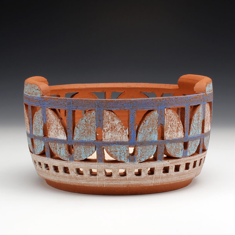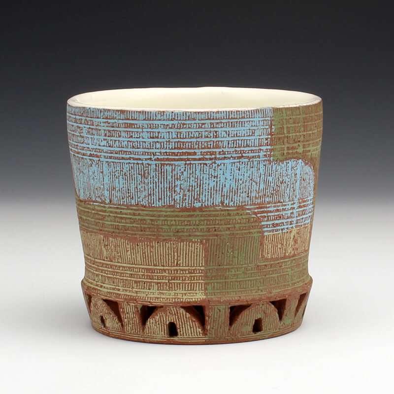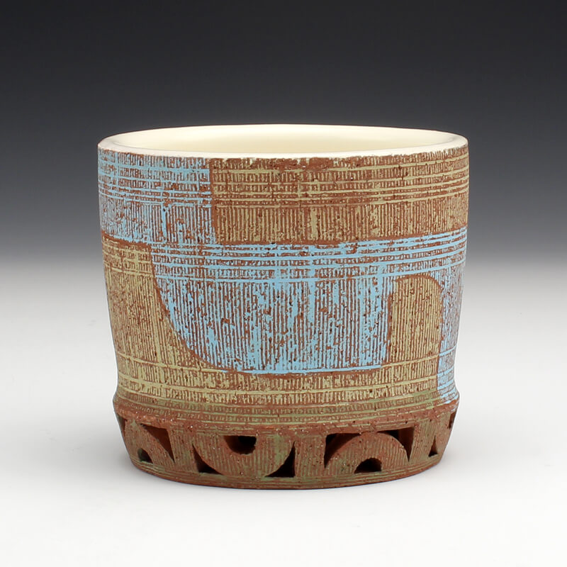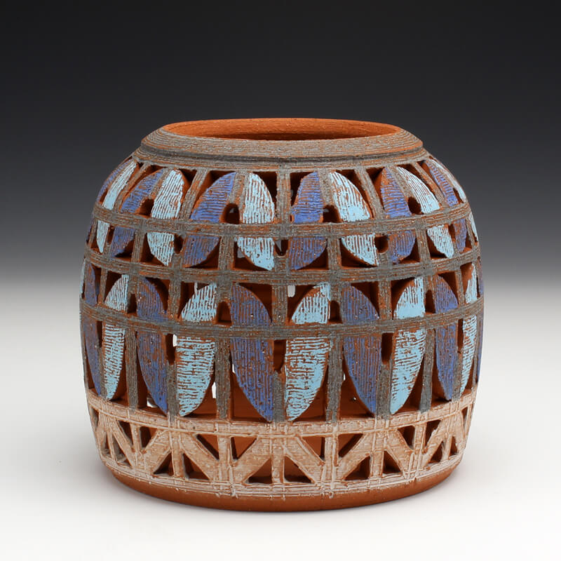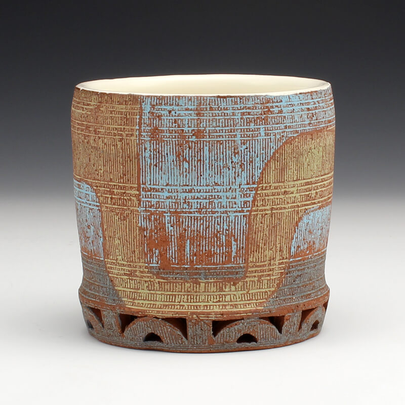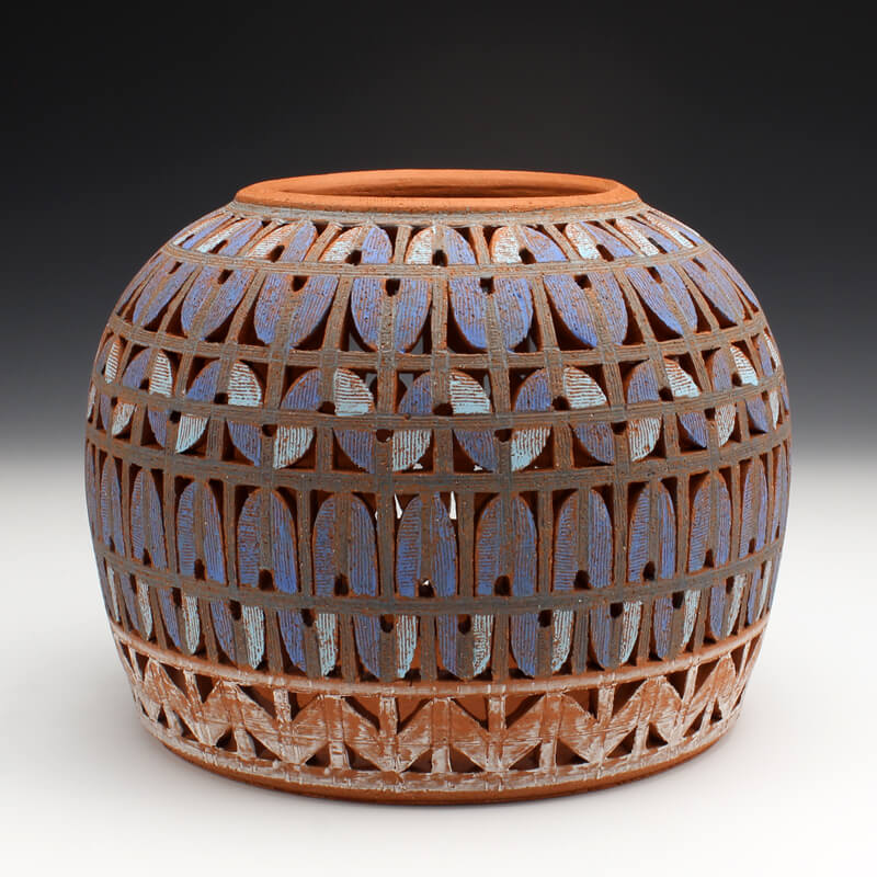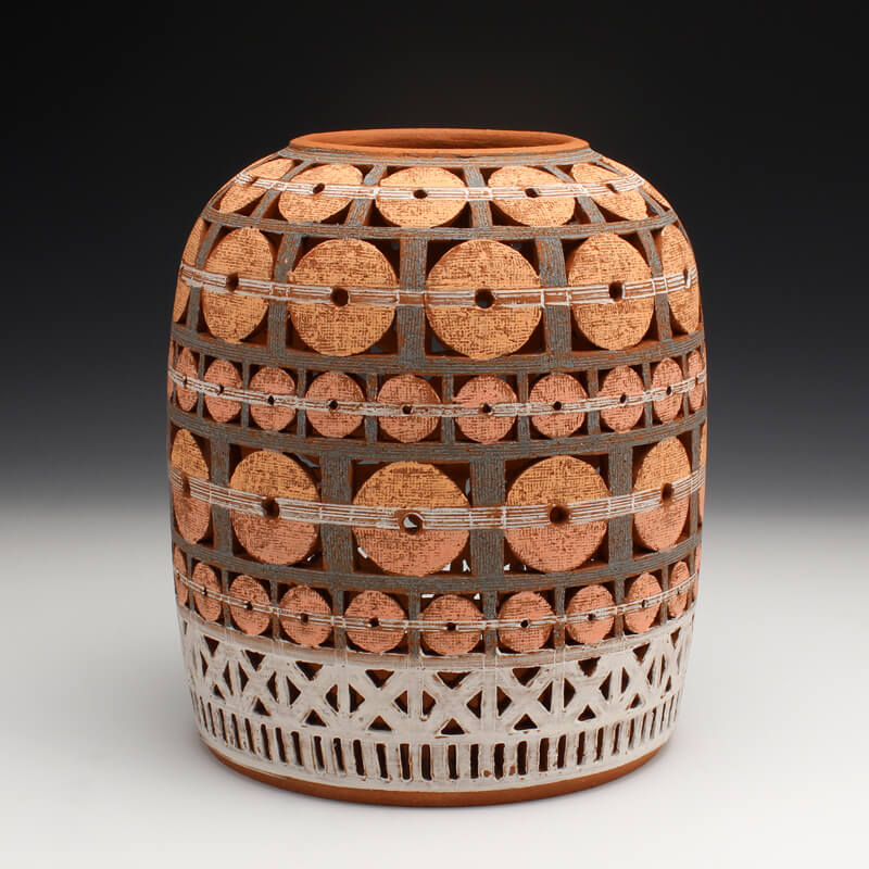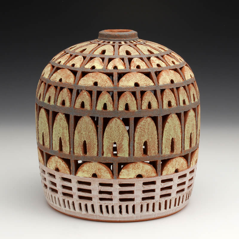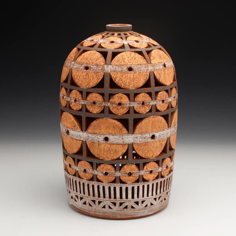“Devoted to repetition and structure, I have most recently been working in pottery forms as my canvas. Having been inspired to pursue the craft through my father, many of my recent forms are an homage to his pots and a recognition of his influence as a potter, builder and craftsman. My process begins with constructing wheel thrown vessels then dismantling them through carving a facade of structure that often pierces the wall of the pots. The pot form appears built by layers of arches, posts, lintels, and discs. All of which are references to architectural elements that influence me.