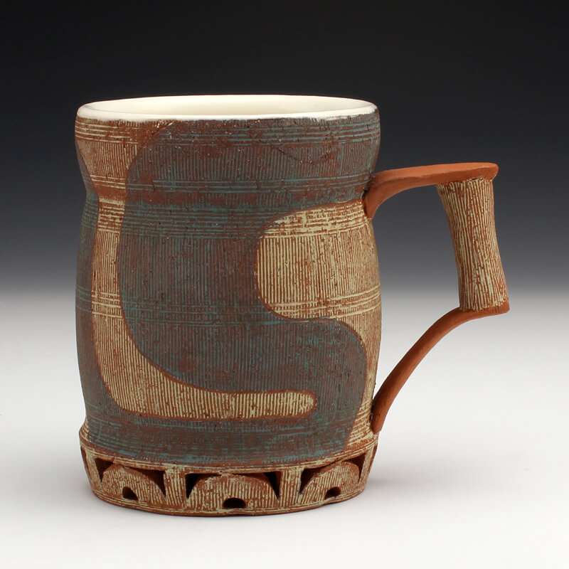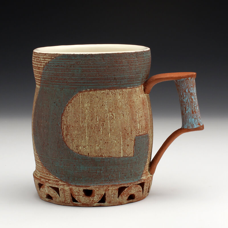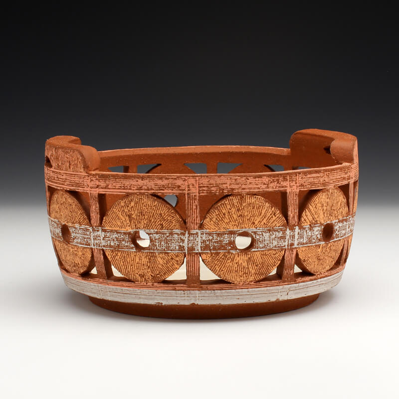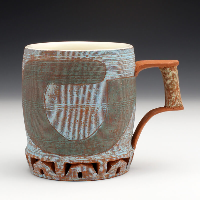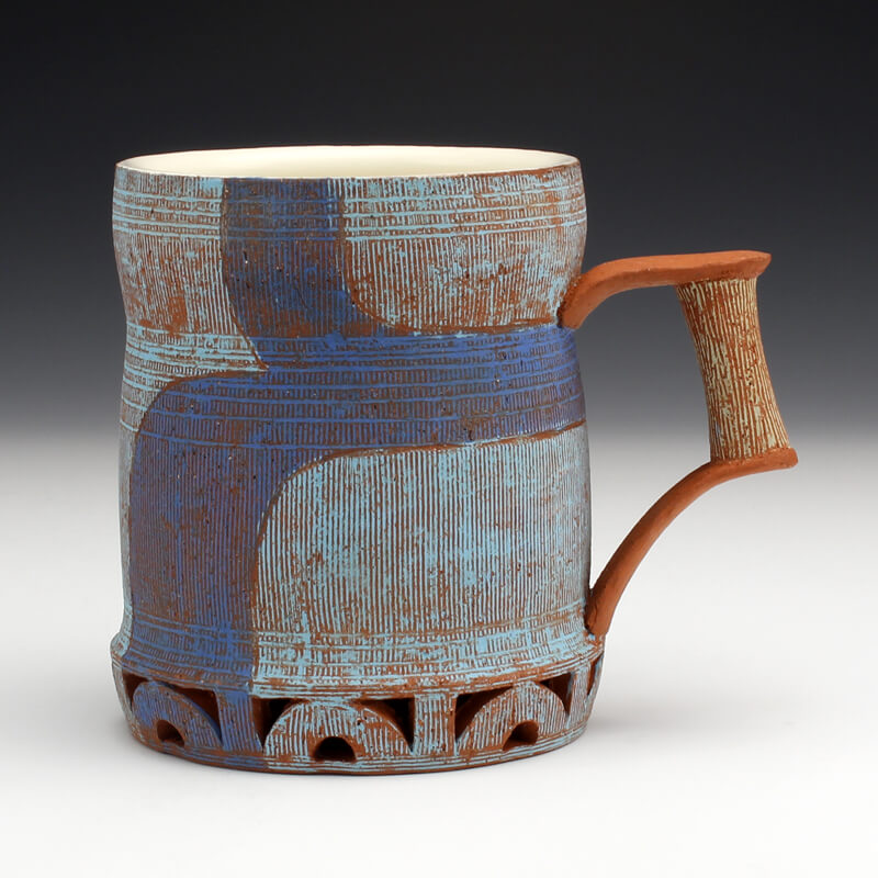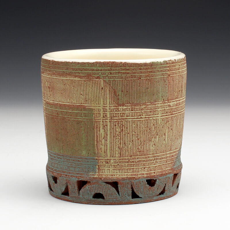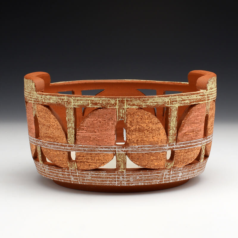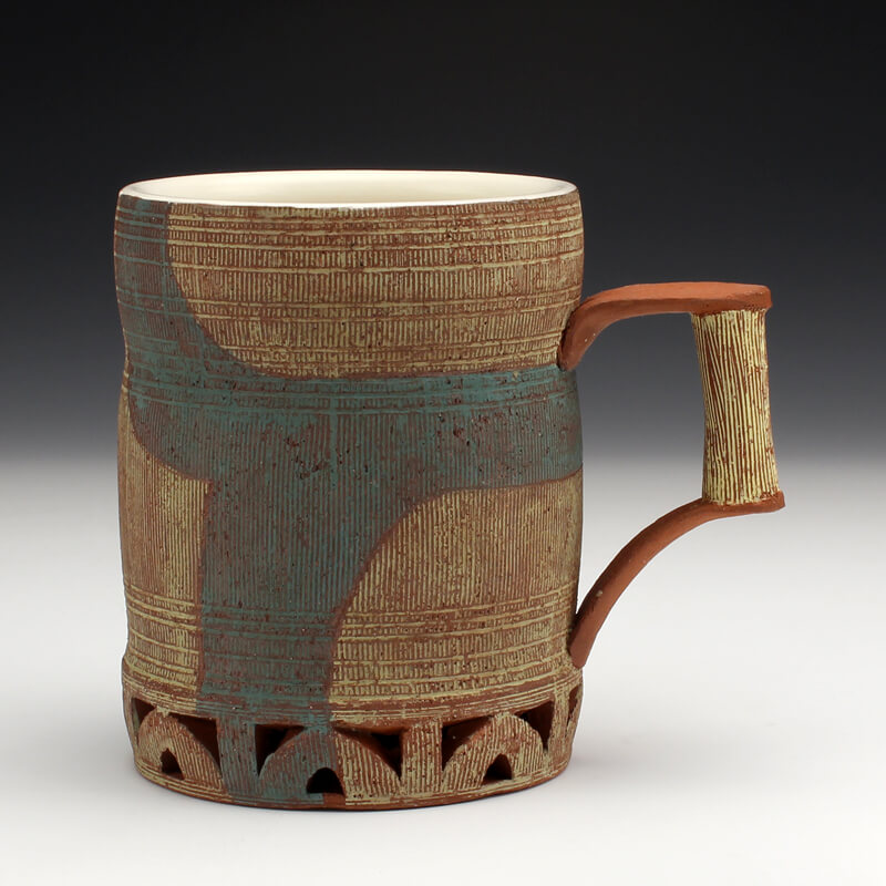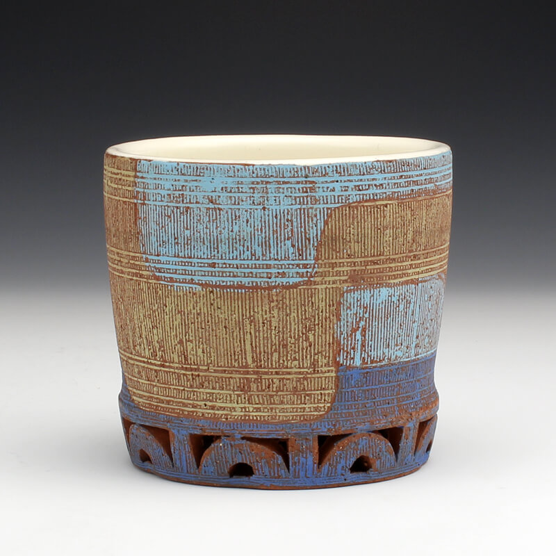 “Devoted to repetition and structure, I have most recently been working in pottery forms as my canvas. Having been inspired to pursue the craft through my father, many of my recent forms are an homage to his pots and a recognition of his influence as a potter, builder and craftsman. My process begins with constructing wheel thrown vessels then dismantling them through carving a facade of structure that often pierces the wall of the pots. The pot form appears built by layers of arches, posts, lintels, and discs. All of which are references to architectural elements that influence me.