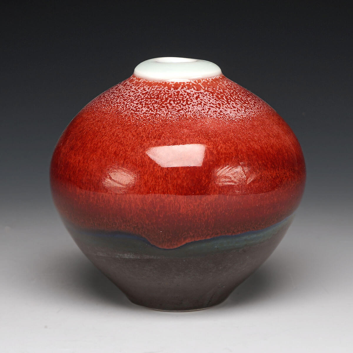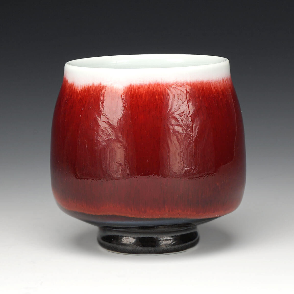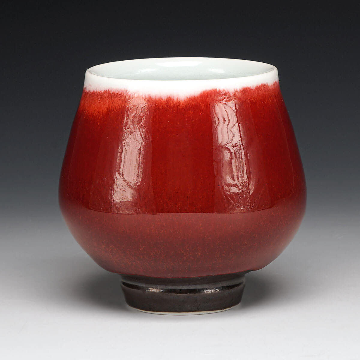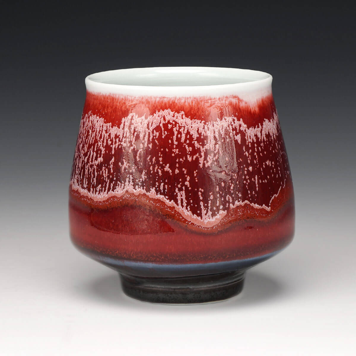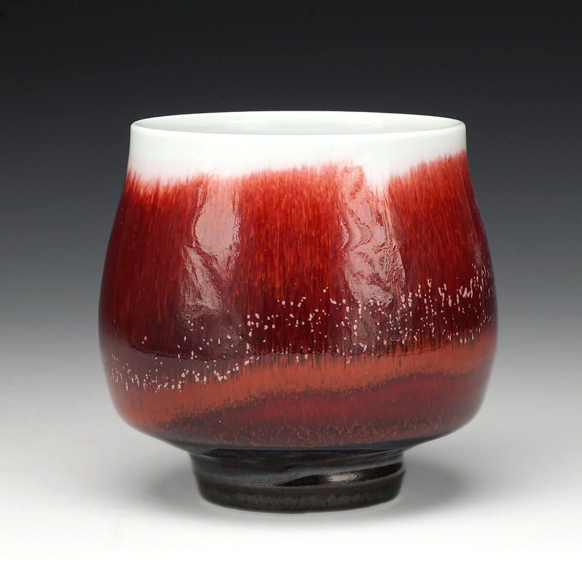 I also have a passion for glazes. They enhance the movement of my work with luminous flowing crystal surfaces and embellish the pots with rich glaze depth and color. Layering of glazes promotes the microcrystalline effects. I have formulated copper red variations with delicate white crystals for cups and vessels, brilliant celadon on white glazes (the Dancing Teapot) and other fascinating microcrystalline effects that are not represented in the limited images.
