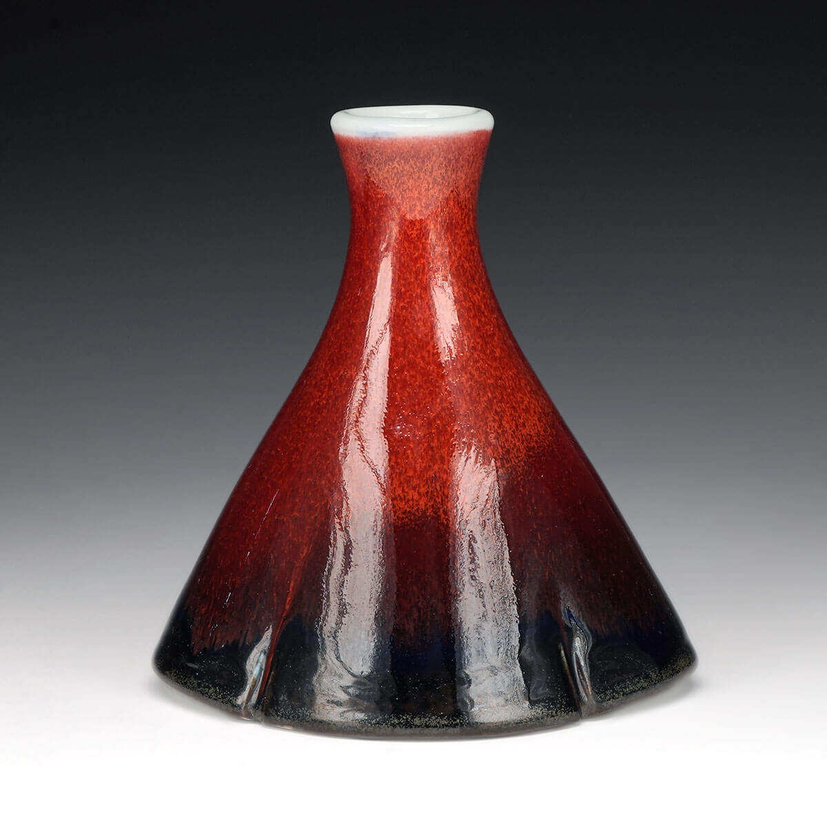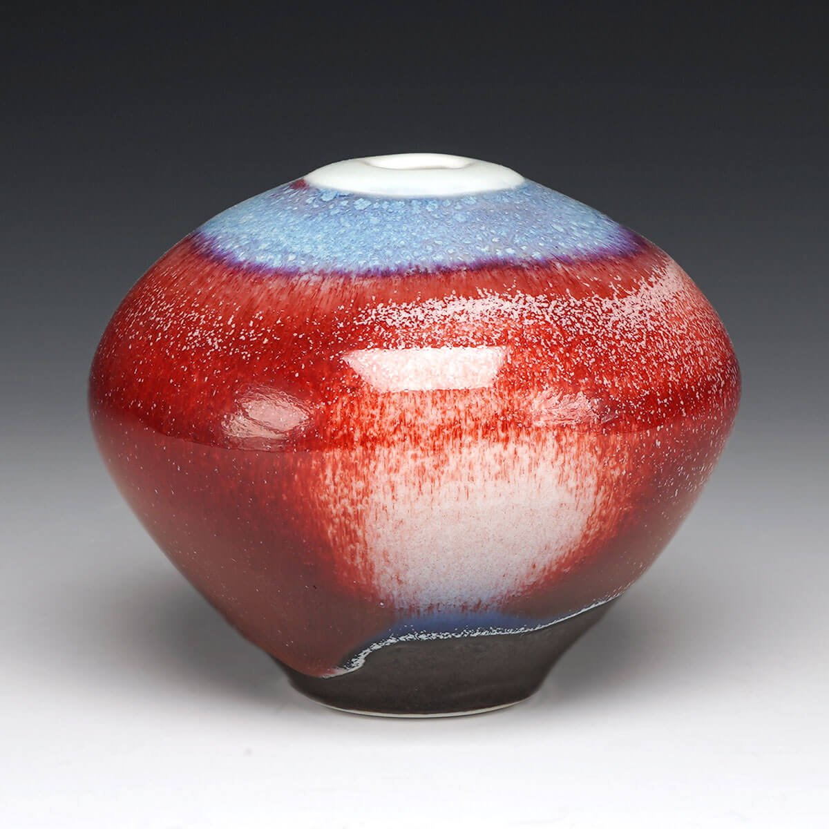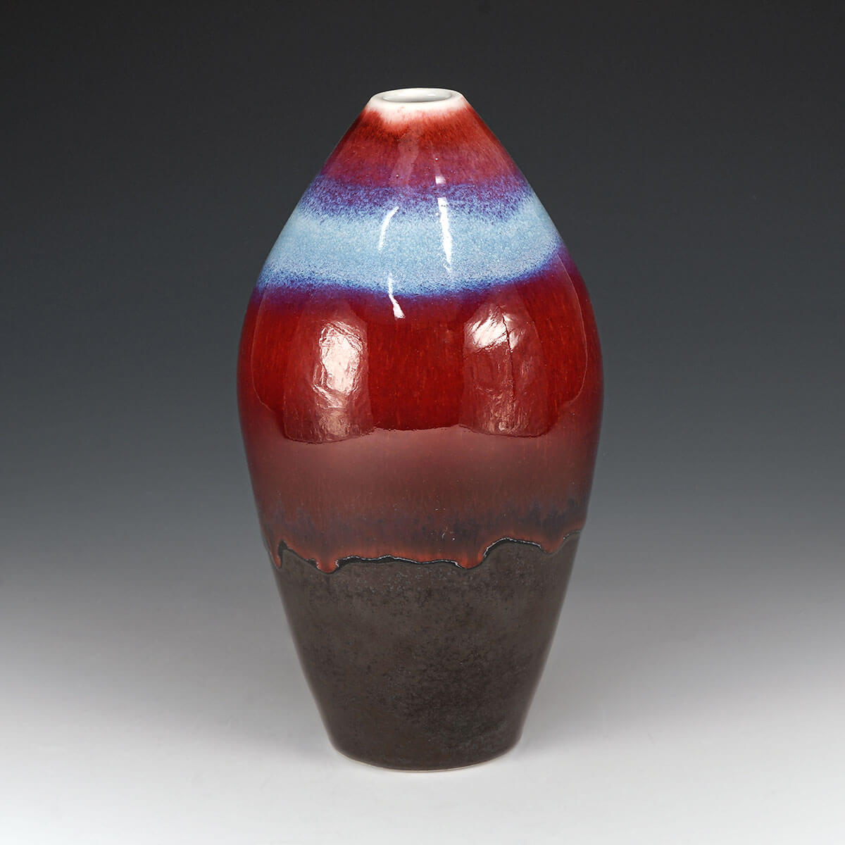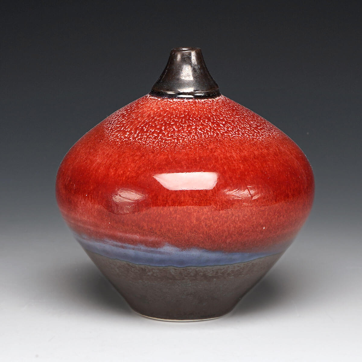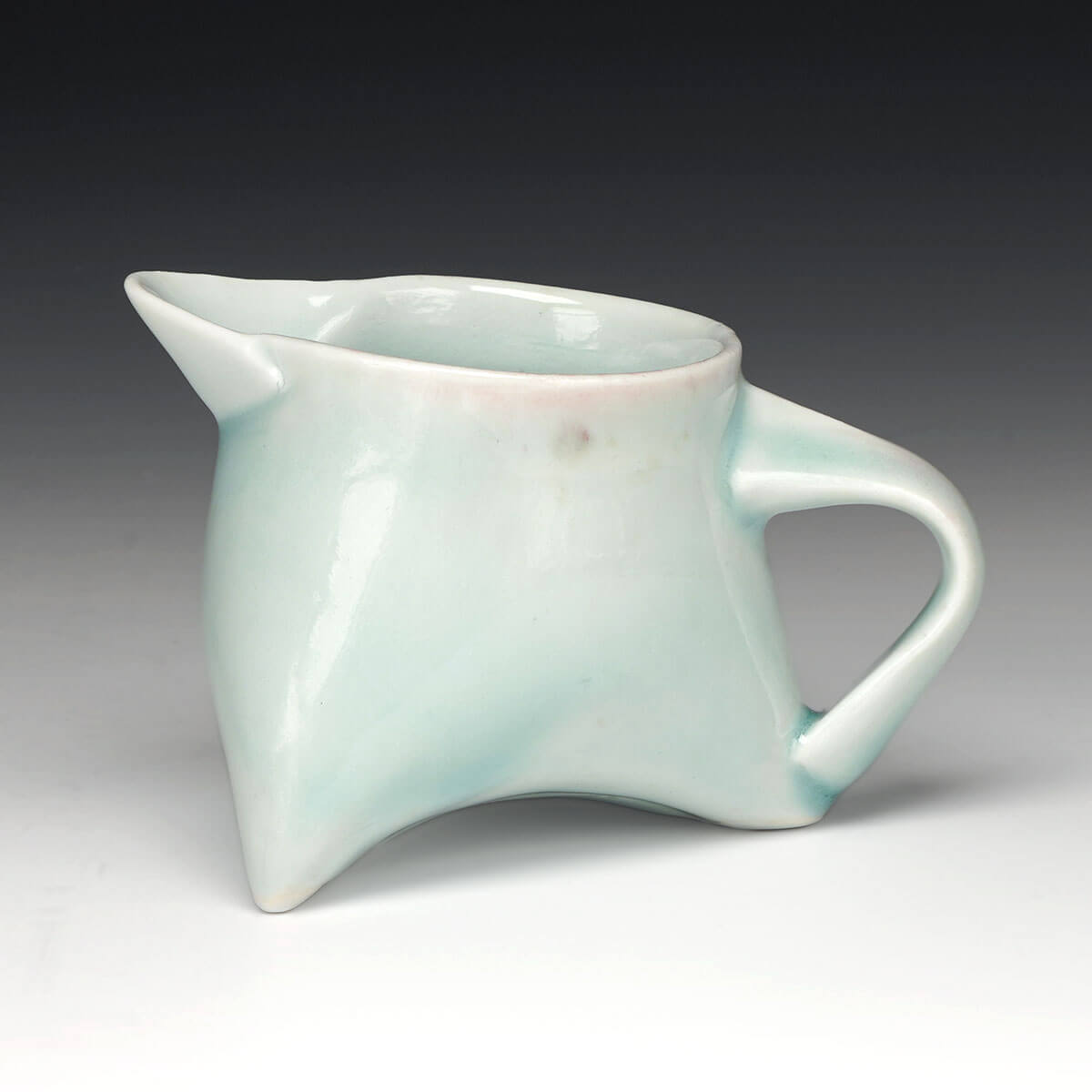 I also have a passion for glazes. They enhance the movement of my work with luminous flowing crystal surfaces and embellish the pots with rich glaze depth and color. Layering of glazes promotes the microcrystalline effects. I have formulated copper red variations with delicate white crystals for cups and vessels, brilliant celadon on white glazes (the Dancing Teapot) and other fascinating microcrystalline effects that are not represented in the limited images.