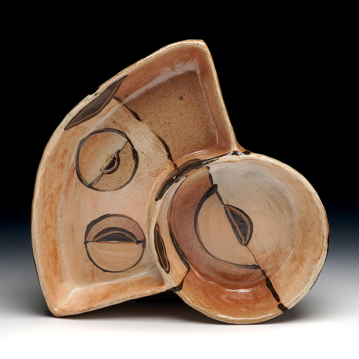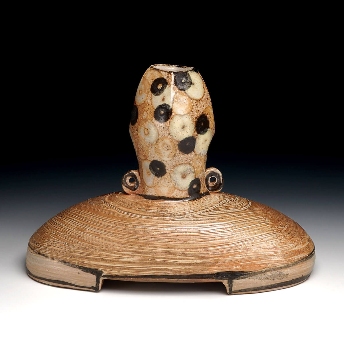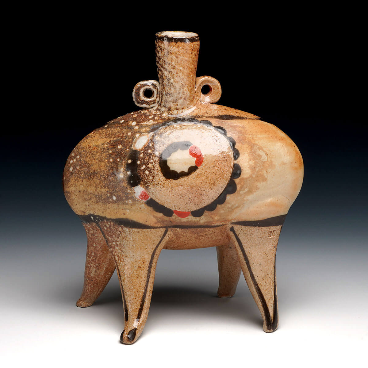 When I make pots, I subtly suggest figure and character by manipulating forms after they are thrown. I roll out clay slabs and use them to hand build elements that are then assembled with thrown parts to create pieces that have a personality of their own. I like to experiment and play with form and proportion on functional ware by altering and stacking parts. When I decorate the surfaces with slips and glazes, I am very interested in making the marks and designs enhance the volume of each pot. I am inspired when I see historical pots from many cultures, including Japan, Crete, Chile, China, and native North American. The pots I respond to may be a quirky Pre-Columbian animal ewer, or the sophisticated designs of a Mimbres bowl.