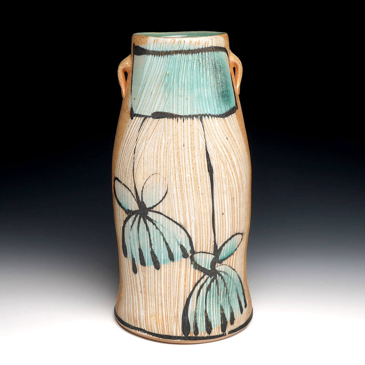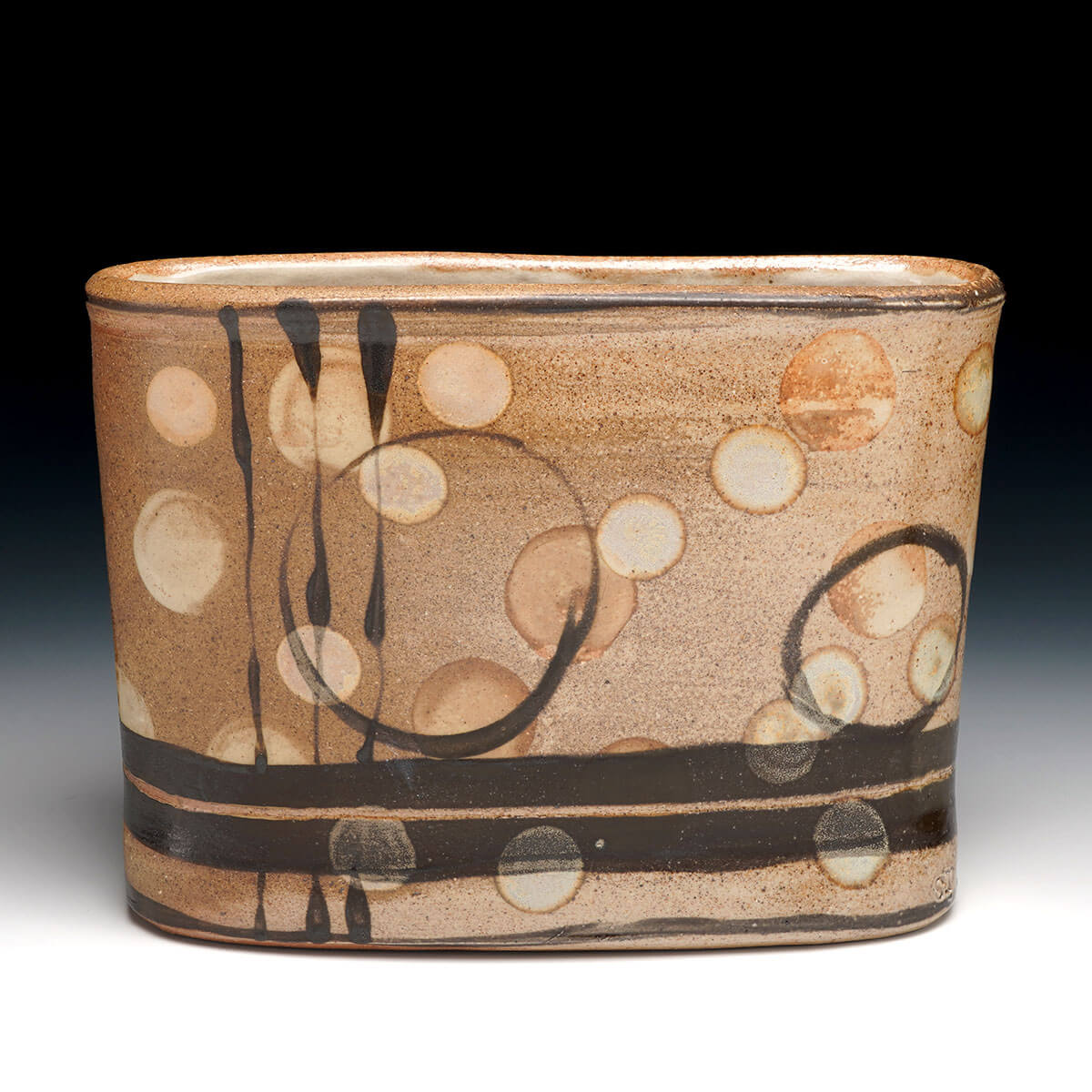 Suze’s stoneware pots subtly suggest figure and character that she manipulates into her forms by altering them after they are thrown. Hand-built elements, made from slabs, are integrated with thrown parts to create functional forms that have a personality of their own. An integral part of her work includes surface decoration that enhances her forms by patterning and painting slips and glazes then once-firing in her salt kiln. Her work is strongly influenced by studying historical ceramics, and she frequently references contemporary pottery ”heroes” who were her teachers, mentors and friends.