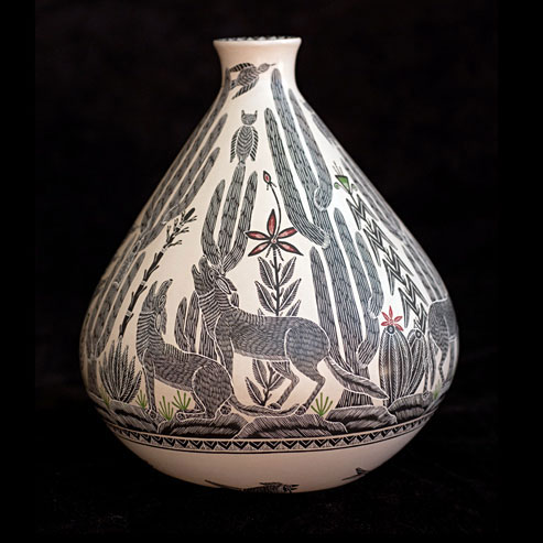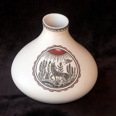 Manolo is the wild-card in the bunch. He is a truly great and humble man, but he is a complete goof-ball. It is had to have real serious conversation with him, because you’ll always find yourself joking and laughing with him. But, his work is fantastic and you never see the same thing from him. He starts on a pot and decorates from a stream of consciousness unique to Manolo; he doesn’t draw or sketch on his pot, like everyone else. His complex tessalations speak to Escher influences, just as you might wonder where his mind’s eye comes up with his effigy figures. His fish pots are highly sought-after and world-famous.