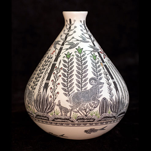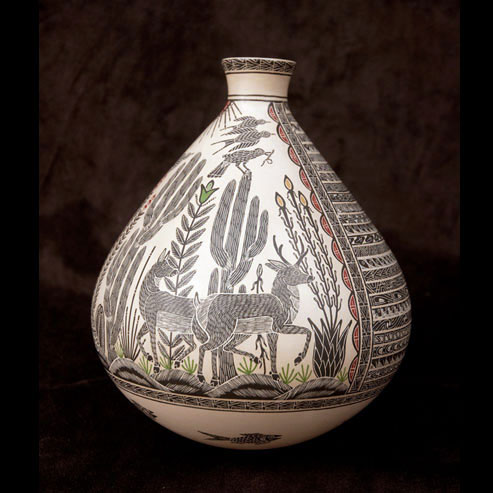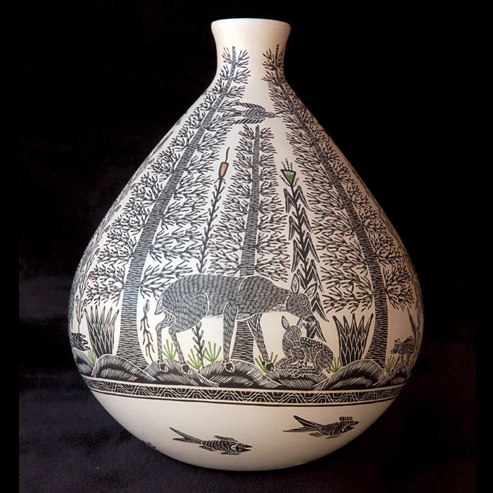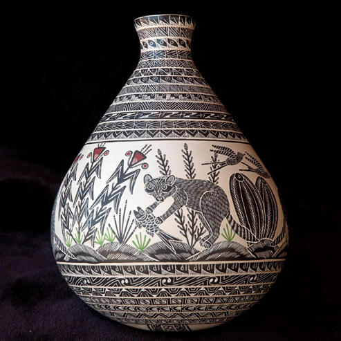 Diego, Manuel and Hector are among the very best of the artists in Mata Ortiz, now just beginning its fourth generation of potters. They are among the new master potters of the village. Diego has lead the vanguard of contemporary design; he is the first to have cut holes – huge, visually moving gestural holes – into his sometimes enormous pots. He is highly educated and widely read; he eschewed an electrical engineering degree to stay with and push his pottery. It was a wise decision, as last year saw him receive the Premier Young Visual Artist (under 30) of Mexico, 2010, receiving this amazing honor from Presidente Felipe Calderon, at the Capitol in Mexico City. He is now a National Living Treasure of Mexico. Diego’s brushwork in unrivaled. Mind you, he (like Manolo and Hector) dug his own clay, processed his clay, made his own slips, made his own brushes from a child’s hair, and then, had the temerity to fire his extraordinary work in his back yard, under a galvanized bucket, with cottonwood bark or cow chips. Go figure.