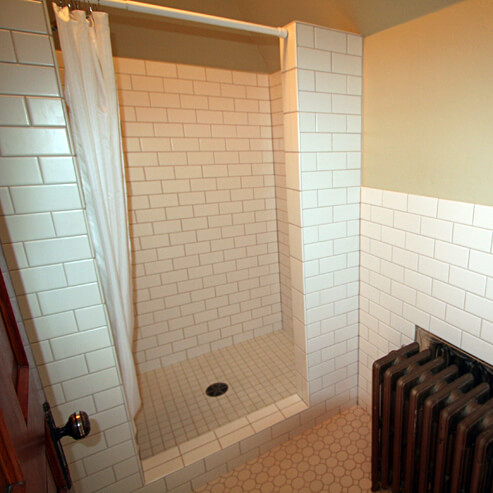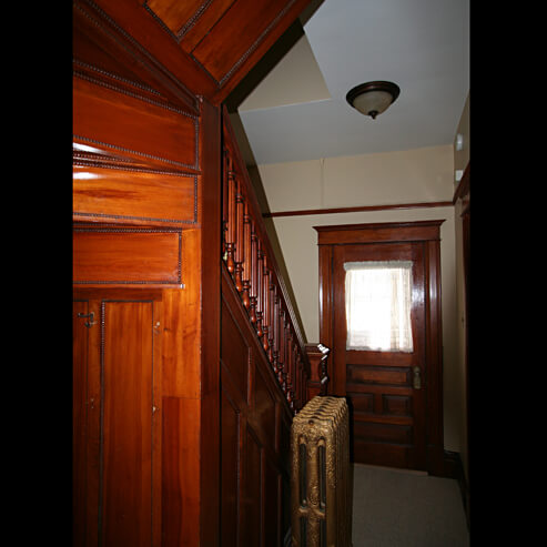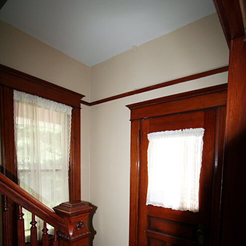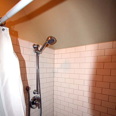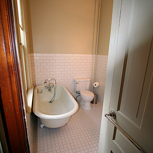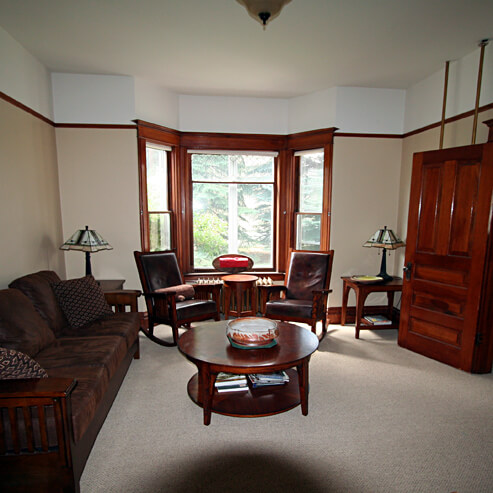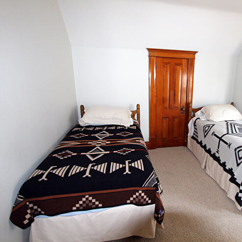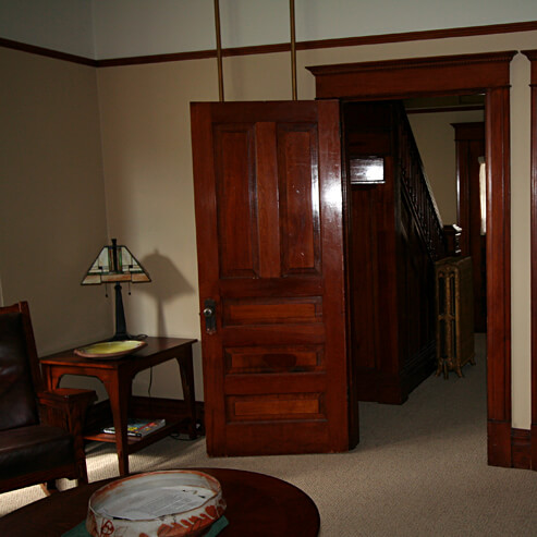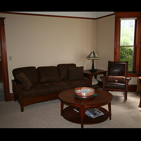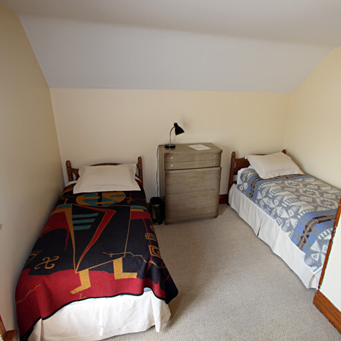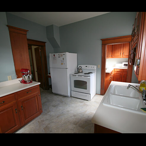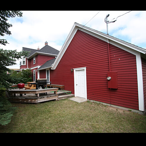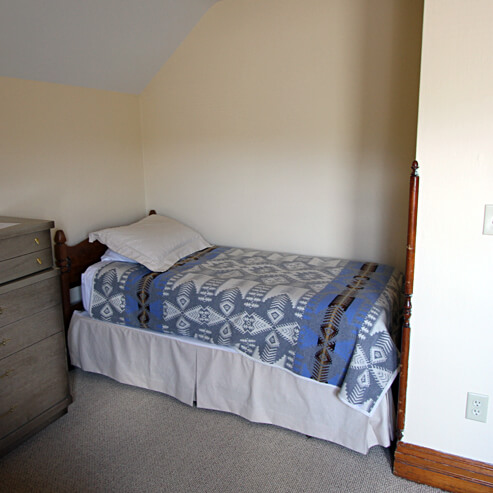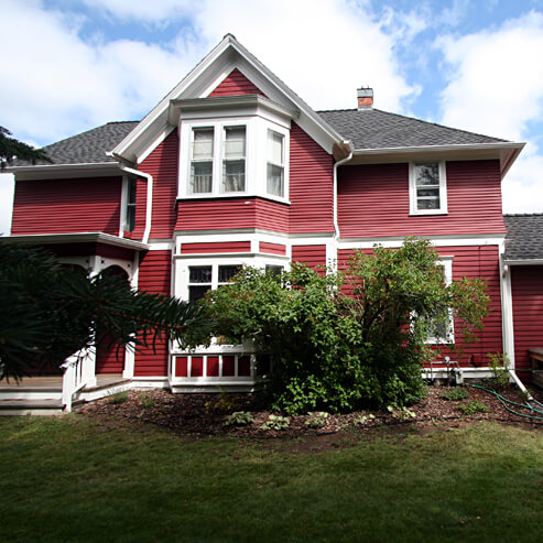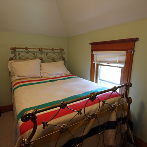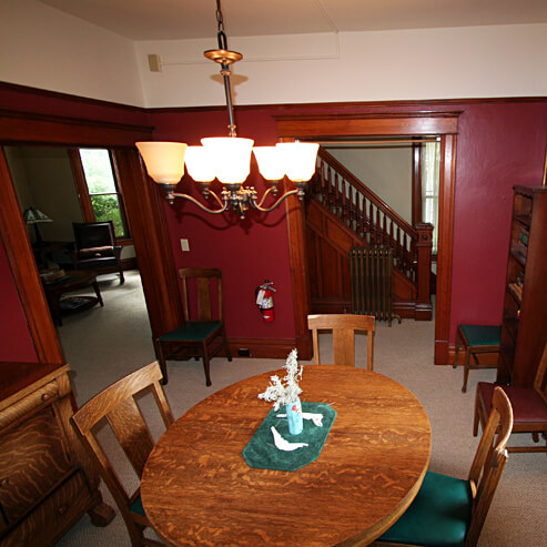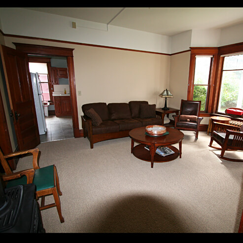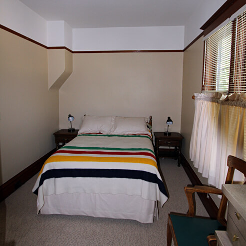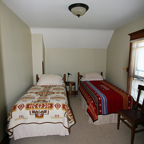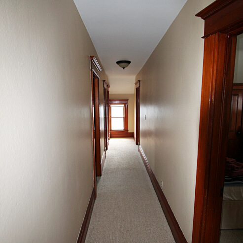 This two story Red and White Victorian in approximately 1900 square feet and has 5 bedrooms. There is one bedroom (with a full bed) on the first floor with a private bathroom attached to the bedroom. The other 4 bedrooms are on the second floor. 3 of the bedrooms have 2 twin beds in them, and 1 bedroom has one full bed. The second bathroom is upstairs, and is split into two rooms- 1 shower room and 1 room that contains the toilet and sink. Maximum capacity of the Red House is 8 residents at a time (with 6 residents sharing a bedroom with one other person).